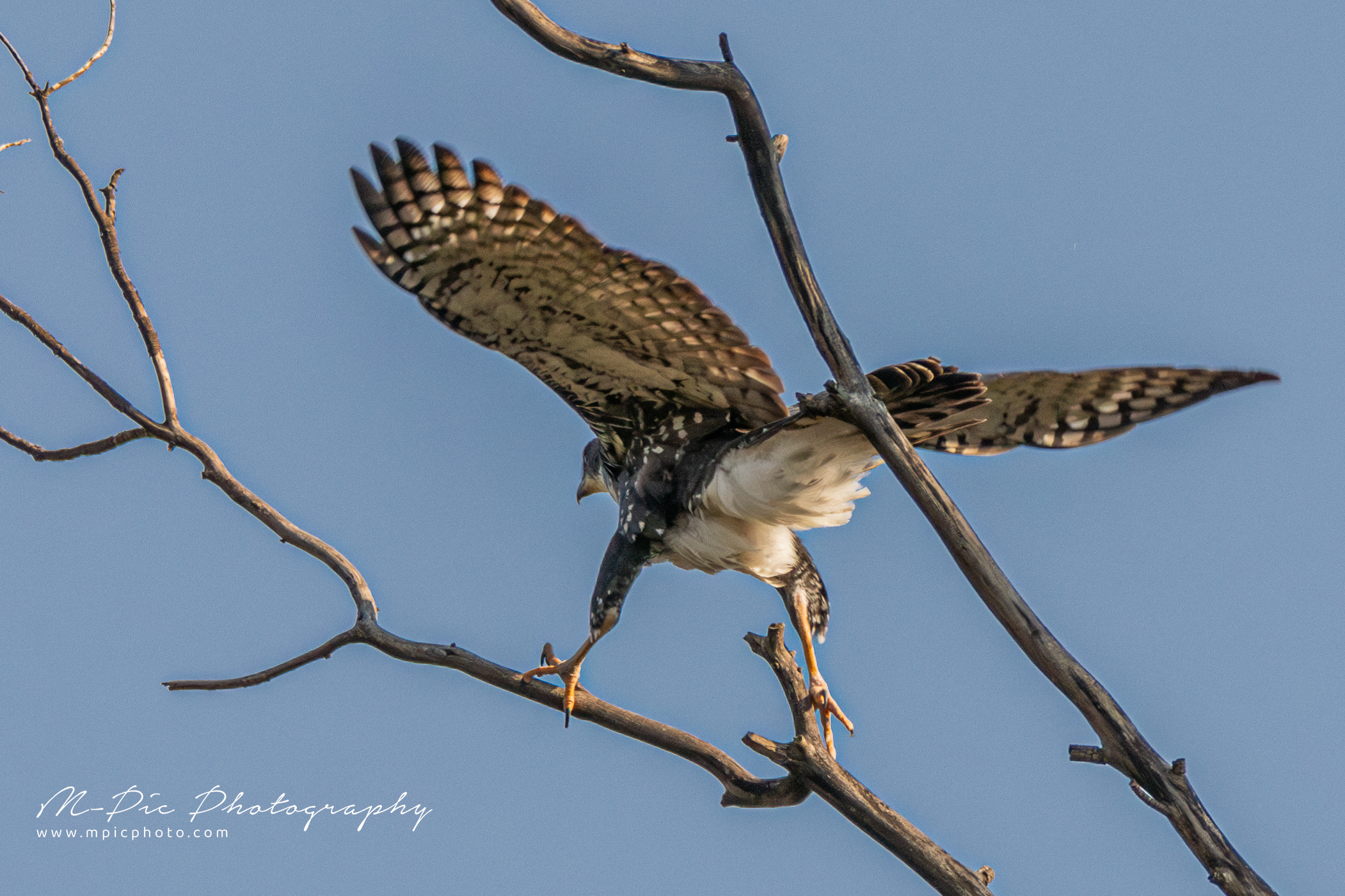 Although it is very difficult to see wherever there is a chick they are very active and noisy certain times of the year. They are normally quite well hidden in the trees but often like to sit in some of the high dead trees where they are more visible. From there they can also spot prey better and keep an eye on their surroundings.